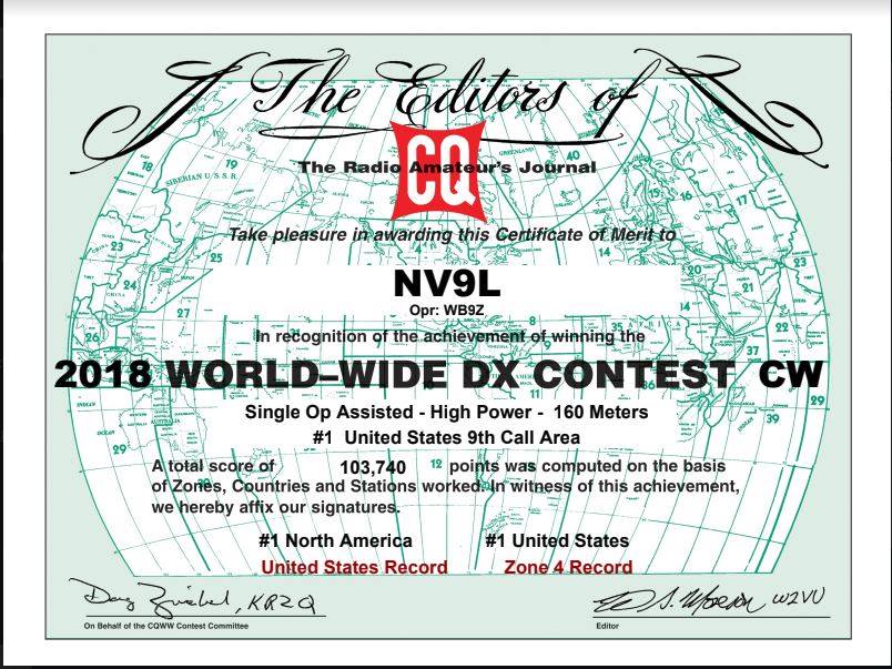 Congratulations to Metro DX member Jerry, WB9Z, operating as NV9L, for winning 2018 CQWW-160 #1 North America, #1 United States, setting a new Zone 4 record and United States record! Amazing!