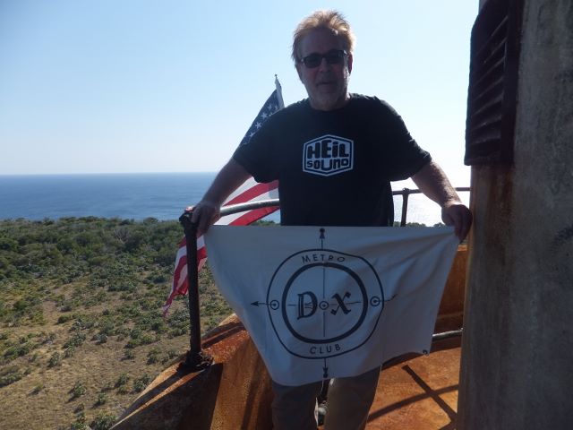 337 on FT8. John/K9EL, Paul/K9NU, John/W9ILY and Mike/W9MK again visited Saint Martin for sun, fine French cuisine and, of course, lots of DX. DXers worldwide were again happy they made the trip. Operations included CW, SSB, RTTY and the newest mode FT8. 2016 Mike/K9AJ was a member of the HUGE DXpedition team that activated South Georgia and South Sandwich islands as VP8SFI/VP8STI in January. VP8STI logged over 54,000 QSOs and VP8STI approximately 80,000! Amazing! Mike/K9AJ and his pediatrician buddy KD6WW activated a very rare IOTA island NA-159 in the Belcher Islands chain for one day in August. They had a successful trip. John/K9EL, Paul/K9NU, John/W9ILY and Jim/N9TK traveled to Saint Martin again for a week following Thanksgiving. THey had fun and made a LOT of DXers happy! 2015 Jerry/WB9Z was part of a huge 14-operator team that activated the very rare Navassa Island as K1N in February. They logged over 140,000 QSOs! Jerry was with the final group leaving the island. CLICK HERE for their story. METRO was present at the great K1N operation, voted as the "DXpedition of the Year" for 2015. Here is Jerry WB9Z with our flag on top of the K1N lighthouse with a beautiful background.