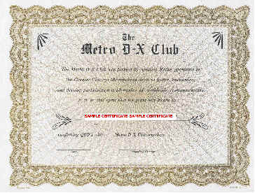 METRO DX GOLD CERTIFICATE An attractive Metro DX Gold Certificate is offered to any station confirming contact with TWO (2) members of the Club. SWL OK. Membership as of July 2020 includes: AC9EF, AF9H(SK 3/9/14), AI9L, K9ACM, K9AJ, K9BBQ (KA9BBQ prior to 25APR2017), K9BWQ(SK 7/16/14), K9CJ, K9CQ, K9CS, K9DRS, K9EGS, K9EL, K9EU, K9GA, K9LOT, K9LS (N9IHZ prior to 2019), K9LSH (WB9LSH prior to 20MAY2014), K9MDO, K9NB, K9NR, K9NU, K9PMV, K9PY, K9TP, K9ZO, KA9IUC, KA9QAT, KA9ZZT, KB9PKI, KD9FQP, KE9I(SK 10/15/14), KM9M, N2BJ, N2WB, N9AKR, N9ALC (SK 04APR2017), N9IHZ (now K9LS in 2019), N9LAH, N9ORD, N9TK, N9WK, NE9A (K9ZAV prior to 1/21/17), NV9L, NV9X, W9AEB, W9ILY, W9IXX, W9KXT, W9LIZ, W9LNQ(SK 6/10/14), W9MK, W9NJB(SK 10/16/16), W9NKV, W9OA,W9PDS, W9TY, W9UM, WA9LEY, WB9FMC, WB9JYZ, WB9Z, WD9HSY, WG9V and WT2P. Some of our members have their own WEB pages. If their callsign is underlined, simply click on the call to go to their page! To obtain our Gold Certificate, a log extract showing each callsign contacted including the date, time, band and mode of contact must be submitted. The extract must be certified by two other hams. The cost of the certificate is US$5.00. PayPal to w9ty@arrl.net can be used. As an alternate, an electronic certificate may be obtained for US$3.00. Contact w9ty@arrl.net for details. The award request, award fee and log extract is to be sent to our club address: METRO DX CLUB 3810 N. Chamlin Dr. Morris IL 60450 USA or by email to awards@metrodxclub.com Click here for a sample log extract. For further information and PayPal details, email awards@metrodxclub.com A GOLD CERTIFICATE was recently awarded to: Joe Feminella, KA9QAT Pierre Jolin, VE2GT John Raiger, K9DRS David Martin, W4DSM Tim Watson, KB1HNZ Mikhail Melnikov, UA9YF Klaus Voigt, DL1DTL Bernard LE NY, SWL F-16527 Nick Zinsstag, HB9DDZ Lawrence Campi, WA5TRX Egbert Hertsen, ON4CAS HISASHI MAZSHITA, JF2SKV Click on his call to see our certificate on his WEB site! CONGRATULATIONS!! Here’s a sample of our Gold Certificate:
