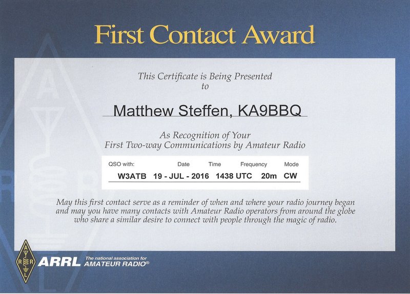 A very special award for KA9BBQ on his VERY FIRST CONTACT!