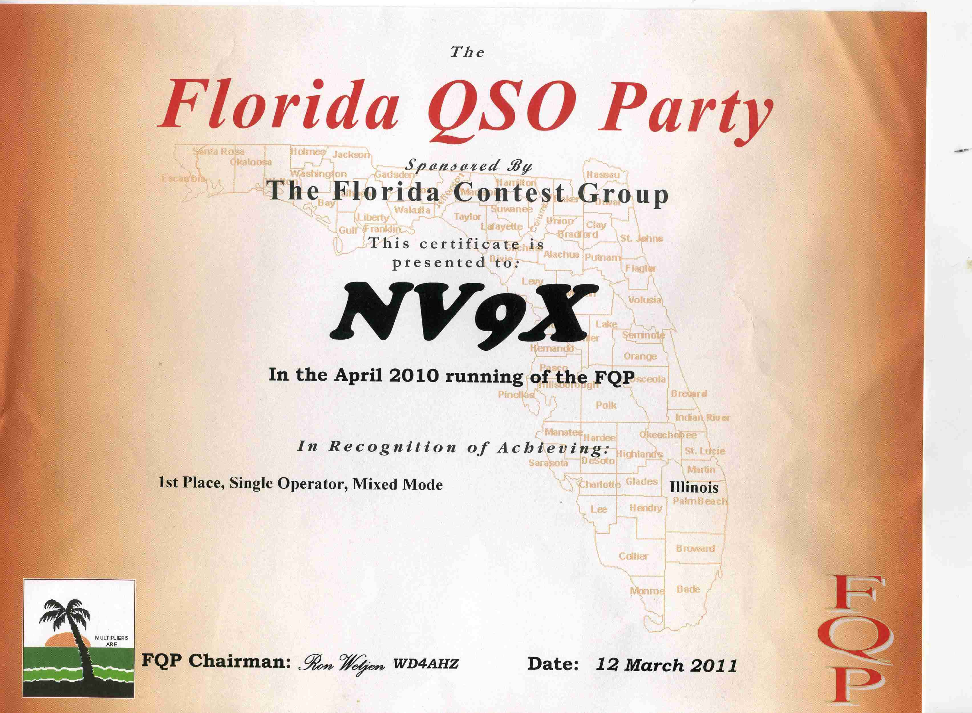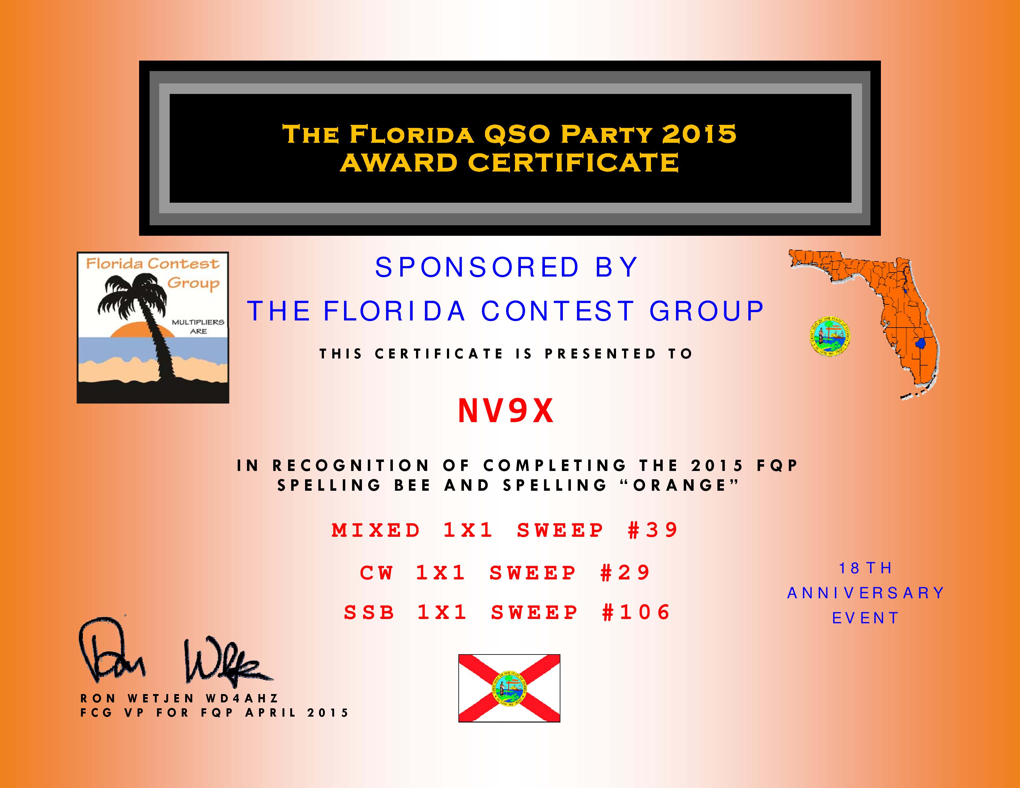NV9X Florida QSO Party 2015 "ORANGE" Award