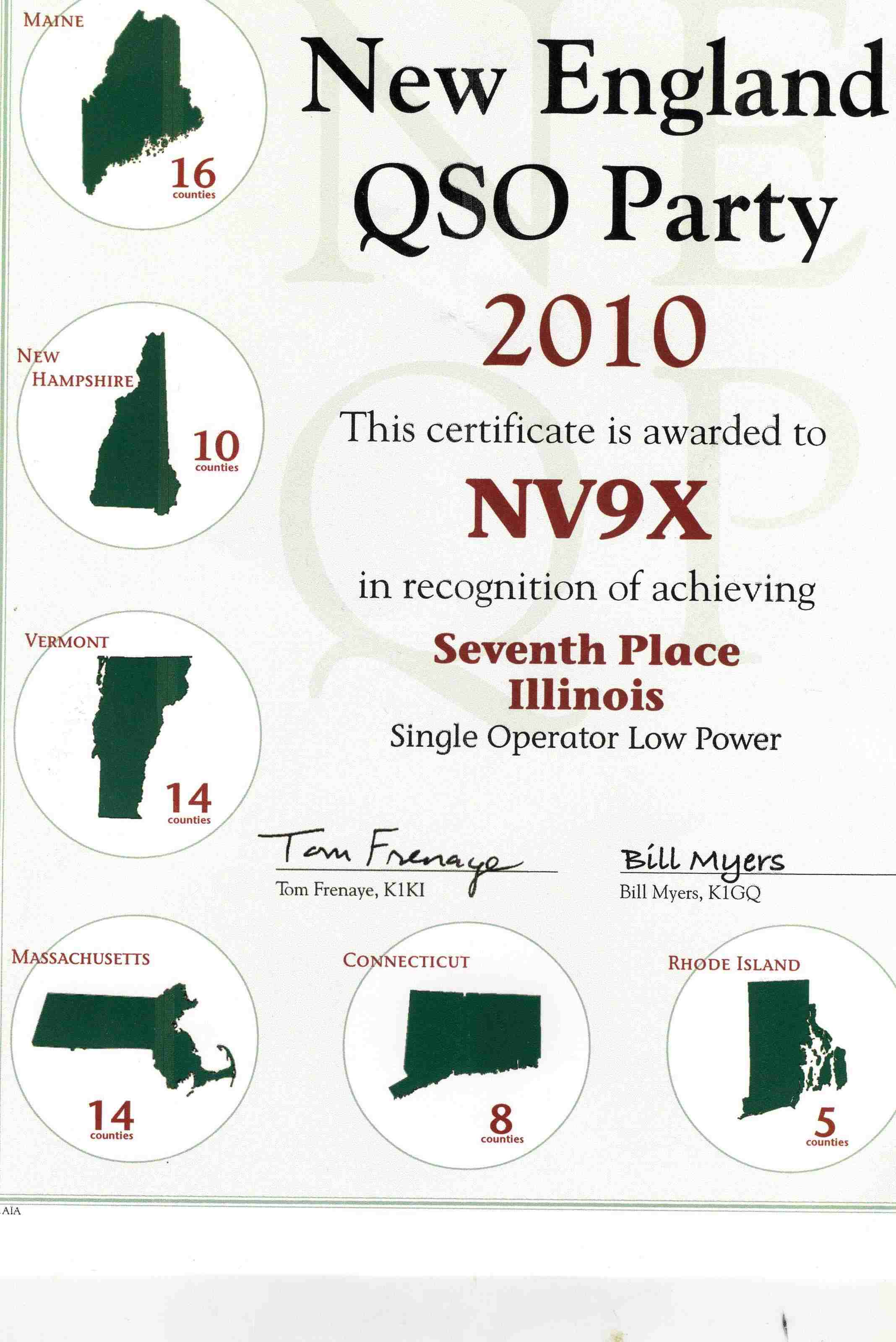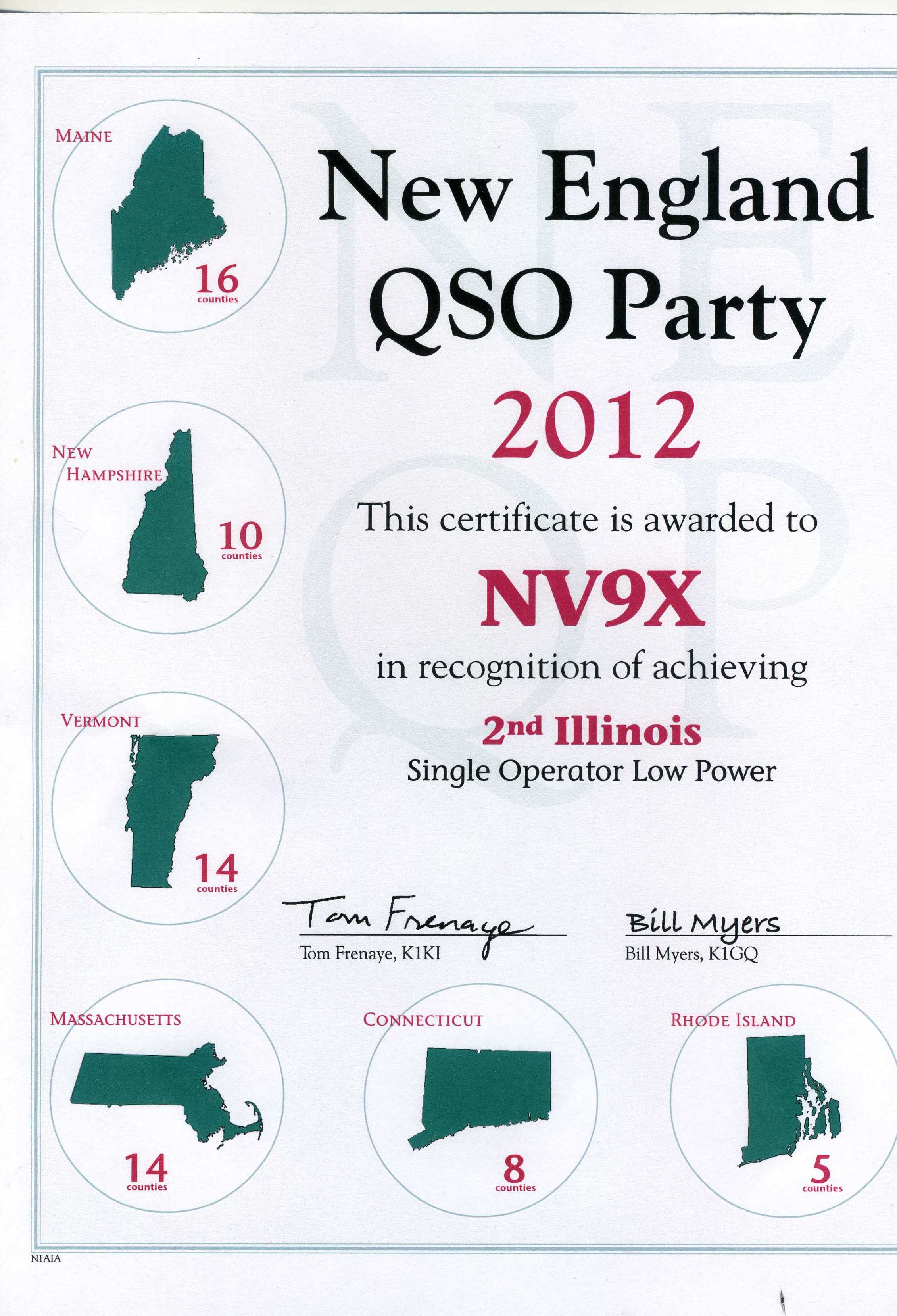 NV9X NE QSO Party 2012 2nd Place IL-LP