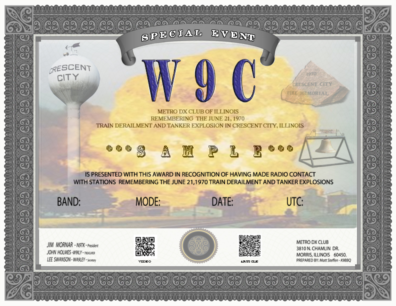 Our thanks to the over 1,000 stations contacting W9C in 2020! The Metro DX Club's 2020 Special Event operation, operated June 19-21, 2020. The event recalled the huge Crescent City FIREBALL that occurred on Father's Day, June 21, 1970. The tragic event happened during the early morning hours when this small town's peace was shattered. Read all the details here: https://www.firehouse.com/home/article/10467137/crescent-city-train-derailment-40-years-later http://www.gendisasters.com/illinois/6526/crescent-city-il-exploding-tank-cars-june-1970 https://www.youtube.com/watch?time_continue=1&v=viFC-RtzlFo&feature=emb_logo